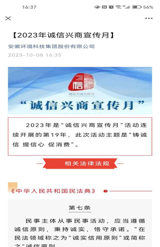 為進(jìn)一步加強(qiáng)社會(huì)信用體系建設(shè),弘揚(yáng)誠(chéng)信文化,引導(dǎo)企業(yè)增強(qiáng)誠(chéng)信興商理念,樹(shù)牢誠(chéng)實(shí)守信意識(shí),省生態(tài)環(huán)境產(chǎn)業(yè)集團(tuán)及各直屬(控股)公司開(kāi)展“誠(chéng)信興商”集中宣傳月活動(dòng)。