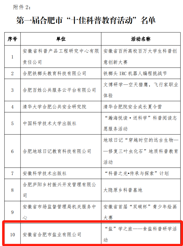 近日,由合肥市科普產(chǎn)業(yè)聯(lián)盟舉辦的第一屆合肥市“十佳展品”“十佳科普教育活動”“科普產(chǎn)業(yè)領軍人物”評選結(jié)果公布,合肥鹽業(yè)“鹽”學之旅——食鹽科普研學活動榮膺第一屆合肥市“十佳科普教育活動”。