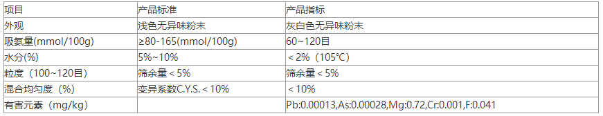 技術(shù)標(biāo)準(zhǔn):SO3:0.0726×10-2水泥膠砂28天抗壓強(qiáng)度62.88×10-2含水率<2%,陽離子交換量:1.0mmol/g。